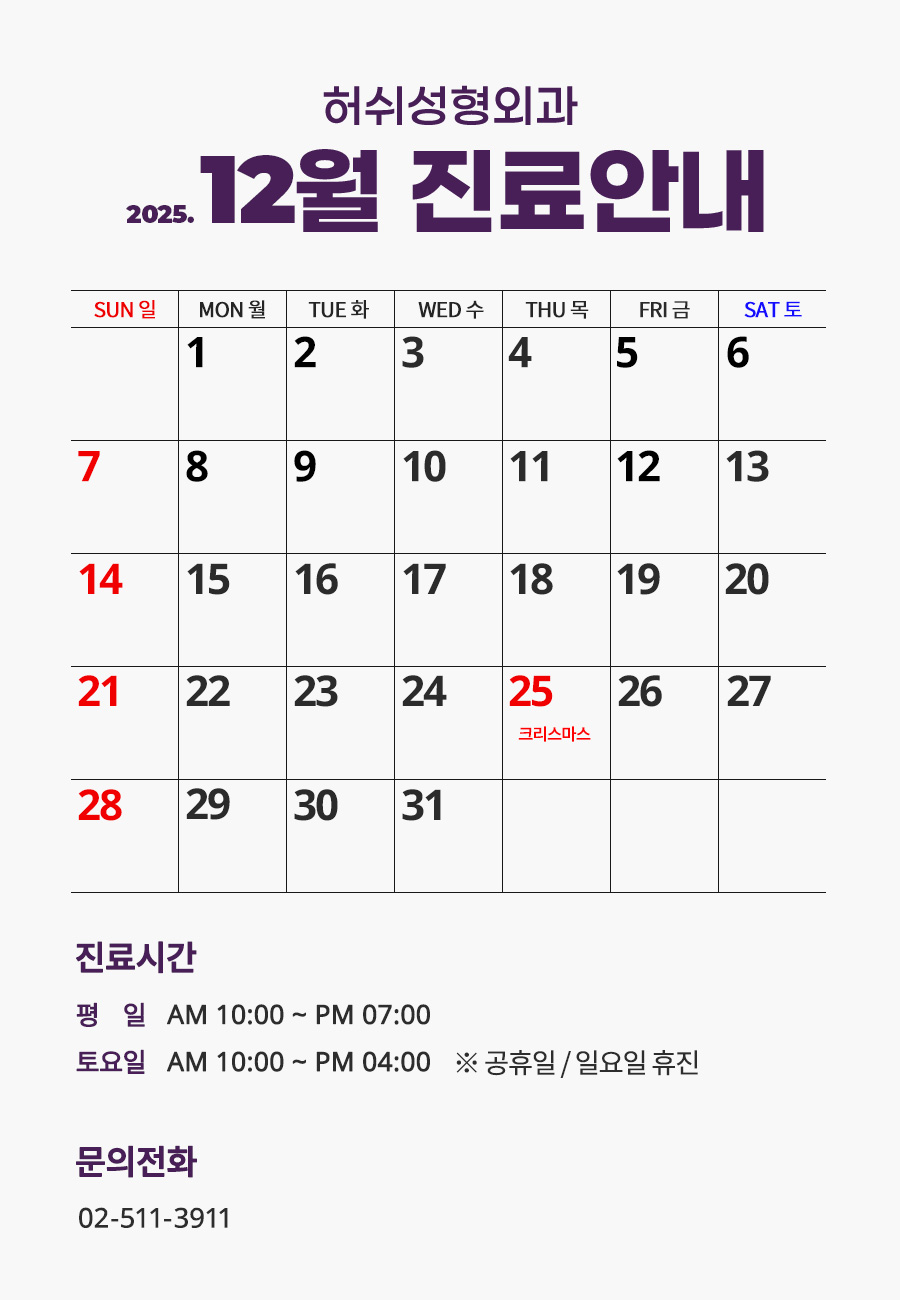 [허쉬성형외과] 2025년 12월 진료일 안내 2025-11-25 hit.217 |