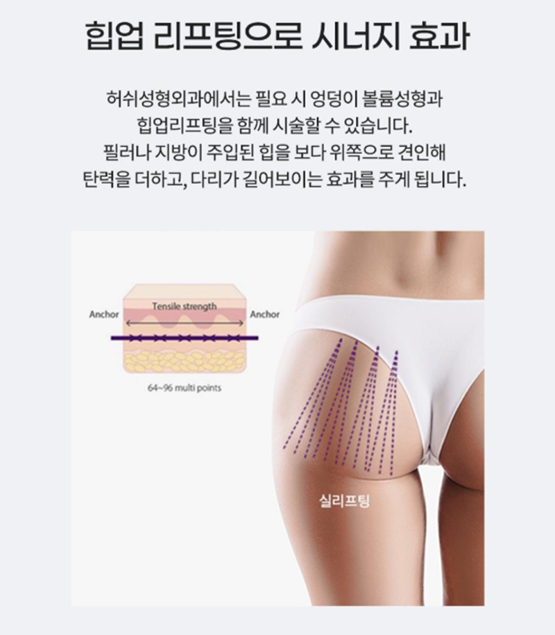 힙업성형의 대표적인 효과 1. 볼륨감 있는 엉덩이 라인 : 평평하거나 납작한 힙에 볼륨을 주어 옷맵시가 살아나는 효과가 있습니다. 특히 청바지나 원피스를 입었을 때 체형 비율이 더 좋아 보이죠. 2. 탄력 개선 및 처짐 완화 : 나이가 들수록 힙이 아래로 처지는 경우가 많은데, 힙업성형은 이러한 문제를 개선해 탄력 있는 느낌을 줍니다. 3. 체형 비율 개선 : 상체 대비 하체의 비율이 균형 잡혀 보이면서, 전체적인 몸매가 더 날씬해 보이는 효과가 있습니다. 4. 운동 효과 보완 : 운동으로 만들기 힘든 부분까지 보완할 수 있어, 보다 빠르고 눈에 띄는 변화가 가능합니다. 이런 분들께 추천합니다. 1. 힙이 처져서 체형이 나이 들어 보이는 경우 2. 힙 볼륨이 적어 바지핏이나 원피스핏이 아쉬운 경우 3. 운동해도 힙 라인이 잘 잡히지 않는 경우 4. 전체적인 바디라인 비율 개선을 원하는 경우 주의사항 및 회복과정 힙업성형은 시술 방식에 따라 회복 기간이 다릅니다. 1. 지방이식은 멍, 붓기가 있을 수 있으며, 회복까지 약 2~3주 정도 소요됩니다. 2. 실 리프팅은 비교적 간단해 바로 일상생활 복귀가 가능합니다. 3. 보형물 삽입은 상대적으로 회복 기간이 길 수 있으며, 안정적인 회복을 위해 관리가 중요합니다. 시술 전 전문 의료진과 충분히 상담하고, 자신의 체형, 피부, 탄력, 라이프 스타일에 맞는 방법을 선택하는 것이 중요합니다.