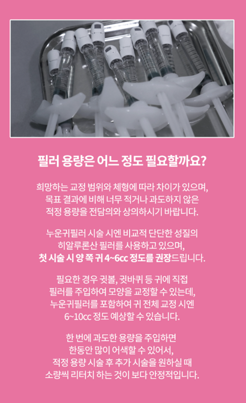 누운귀필러 시술 전 알아두면 좋은 부작용 정보 오늘은 누운귀필러 부작용에 대해 간단히 알아보도록 하겠습니다~! 누운귀는 귀가 머리에 딱 붙지 않고 옆으로 누워 보이는 형태를 말합니다. 귀 모양은 얼굴 전체의 균형에 은근히 큰 영향을 주는데요. 특히 정면이나 옆모습에서 귀가 눌려 보이면 답답하거나 얼굴이 넓어 보이는 인상을 줄 수 있습니다.이때 간단히 선택할 수 있는 방법이 바로 "누운귀필러"입니다. 귀 뿌리나 특정 부위에 필러를 주입해 귀를 세워주고 보다 입체적이고 자연스러운 모양을 만들어주는 시술이죠.