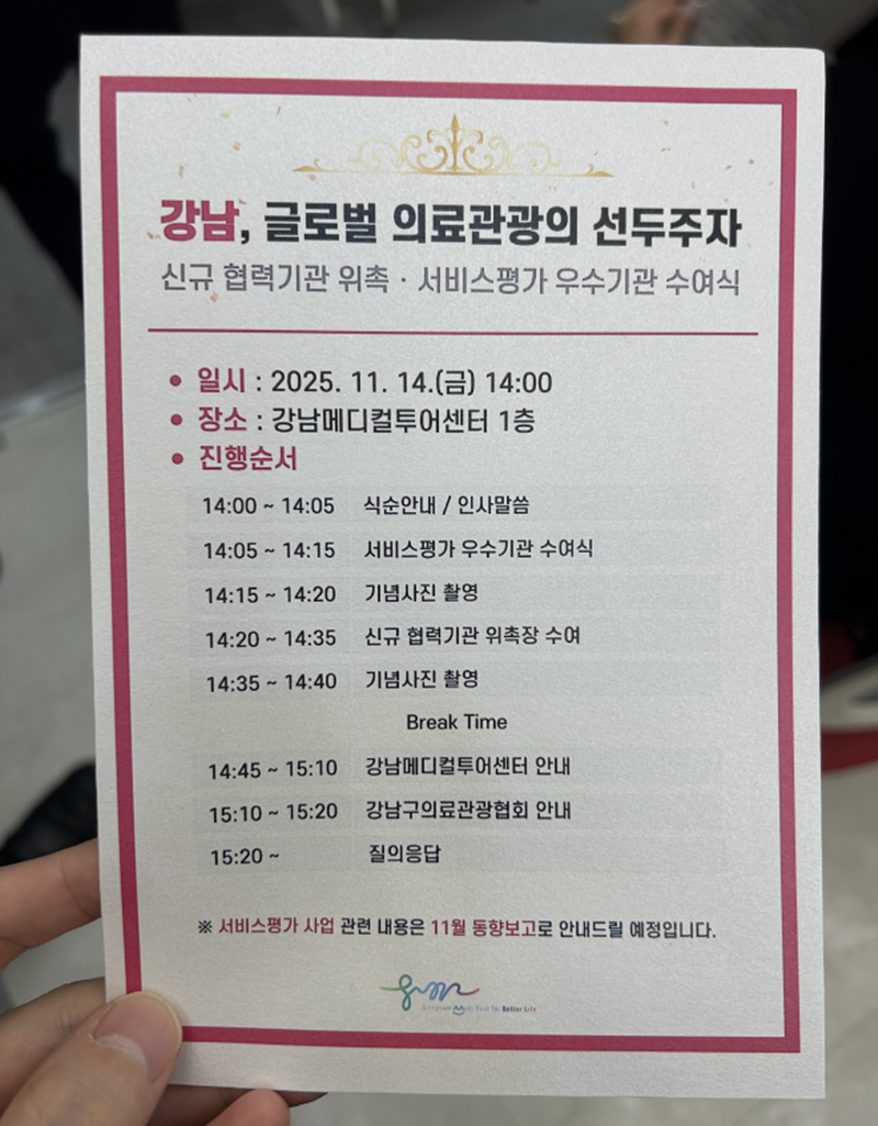 K-뷰티 메디컬의 중심, 강남구의 의료관광 비전을 확인하다. 지난 11월 14일 강남메디컬투어센터에서, 서울 강남구가 주최한 “2025 강남 글로벌 의료관광” 행사에 다녀왔습니다. 이번 행사는 신규 협력 기관 위촉식과 서비스 평가 우수 기관 수여식이 동시에 진행되어, 대한민국 의료 관광의 현주소, 미래를 한눈에 볼 수 있었던 의미 있는 자리였습니다. 행사 개요 행사명 : 2025 강남 글로벌 의료관광 신규 협력기관 위촉식 & 서비스평가 우수기관 수여식 주최 : 강남구 목적 : 강남 의료관광 산업의 글로벌 경쟁력 강화, 우수기관 인증 및 신규 협력기관 지정 참석 대상 : 성형외과·피부과·치과 등 의료기관, 관광 관련 기관, 의료관광 관계자 등 강남구는 매년 의료관광 방문객의 비중이 높은 만큼, 글로벌 의료 허브로서의 역할 강화를 위해 다양한 인증 프로그램과 기관 간 네트워크를 운영하고 있습니다. 이번 행사는 그러한 노력의 연장선으로 진행되었습니다.