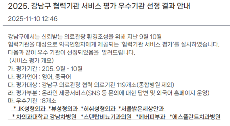 2025 강남 의료관광 서비스평가 우수기관 선정 2025-11-17 hit.1,100 |