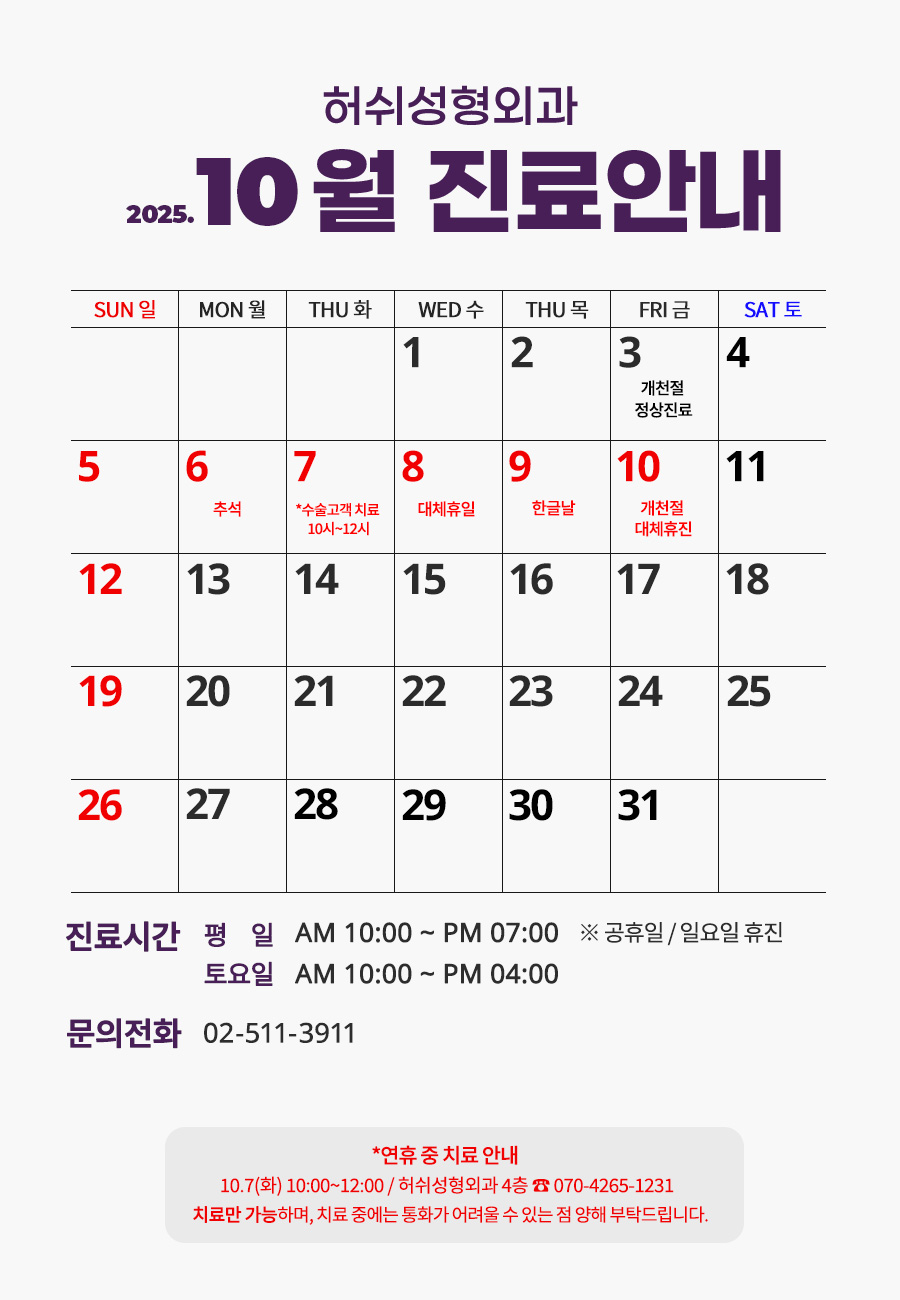 [허쉬성형외과] 2025년 10월 진료일 안내 2025-09-25 hit.1,078 |
